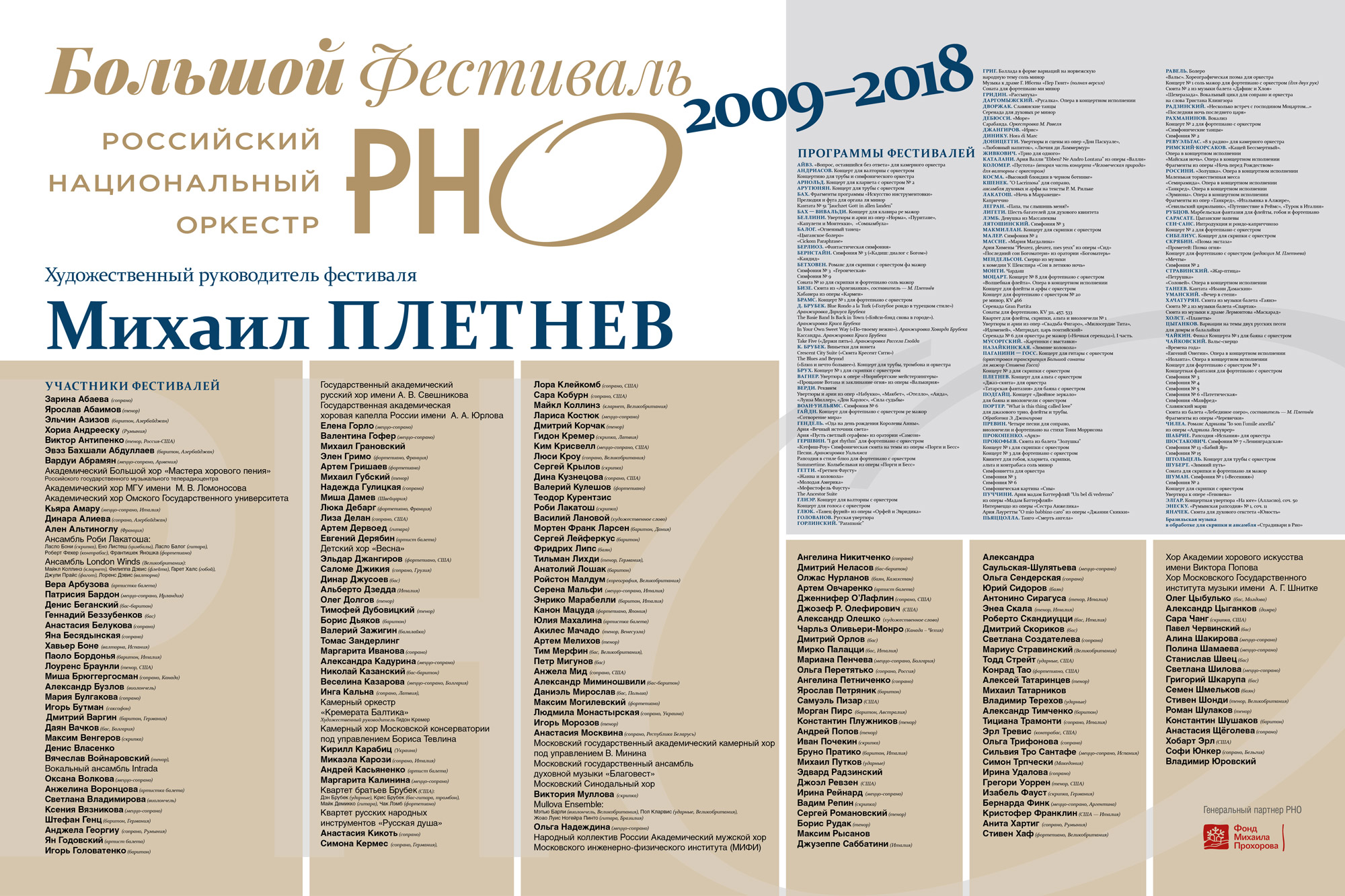 Большой фестиваль РНО – одно из самых заметных художественных явлений концертной жизни Москвы и России. За десять лет своего существования он стал узнаваемым и популярным брендом, снискав безусловную любовь публики и безоговорочное признание профессионального экспертного сообщества. «Фестиваль, которым оркестр, по сути, отмечал перемены в своем статусе (из «первого частного оркестра в России» РНО превратился в еще один государственный), впервые прошел в 2009 году, еще на Новой сцене Большого театра. В первый же год он поразил невиданной концептуальной цельностью и строгостью, музыкантским совершенством и эстетизмом…» (Юлия Бедерова, газета «КоммерсантЪ», 12 сентября 2018).