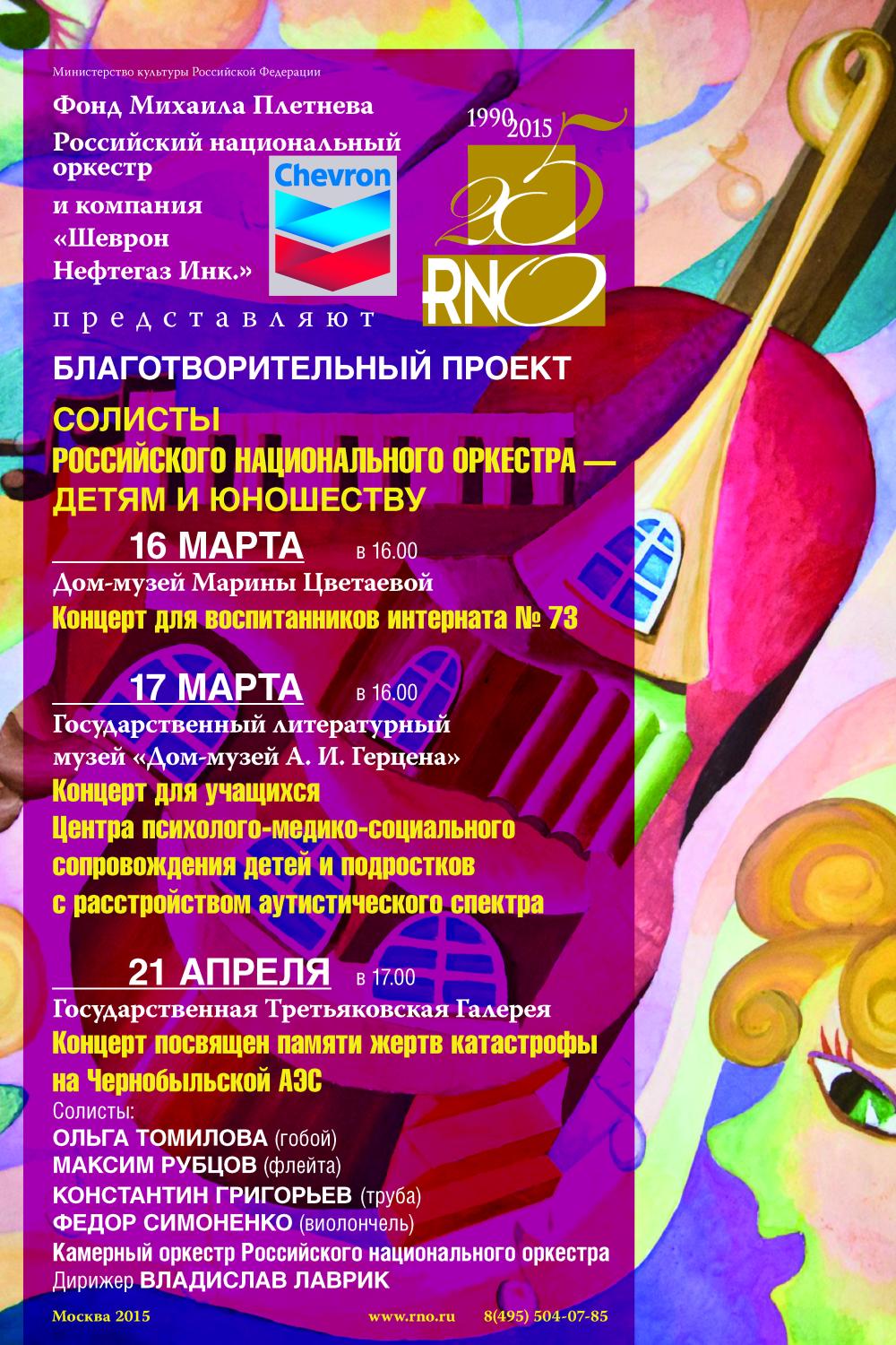 Российский национальный оркестр совместно с компанией «Шеврон Нефтегаз Инк.» ежегодно проводит серию благотворительных концертов «Солисты РНО — детям и юношеству». Проект существует уже четырнадцать лет. За эти годы слушателями концертов побывали воспитанники детских домов и школ-интернатов, ребята из детских садов для слабовидящих, пациенты детских больниц, учащиеся художественных и музыкальных училищ.