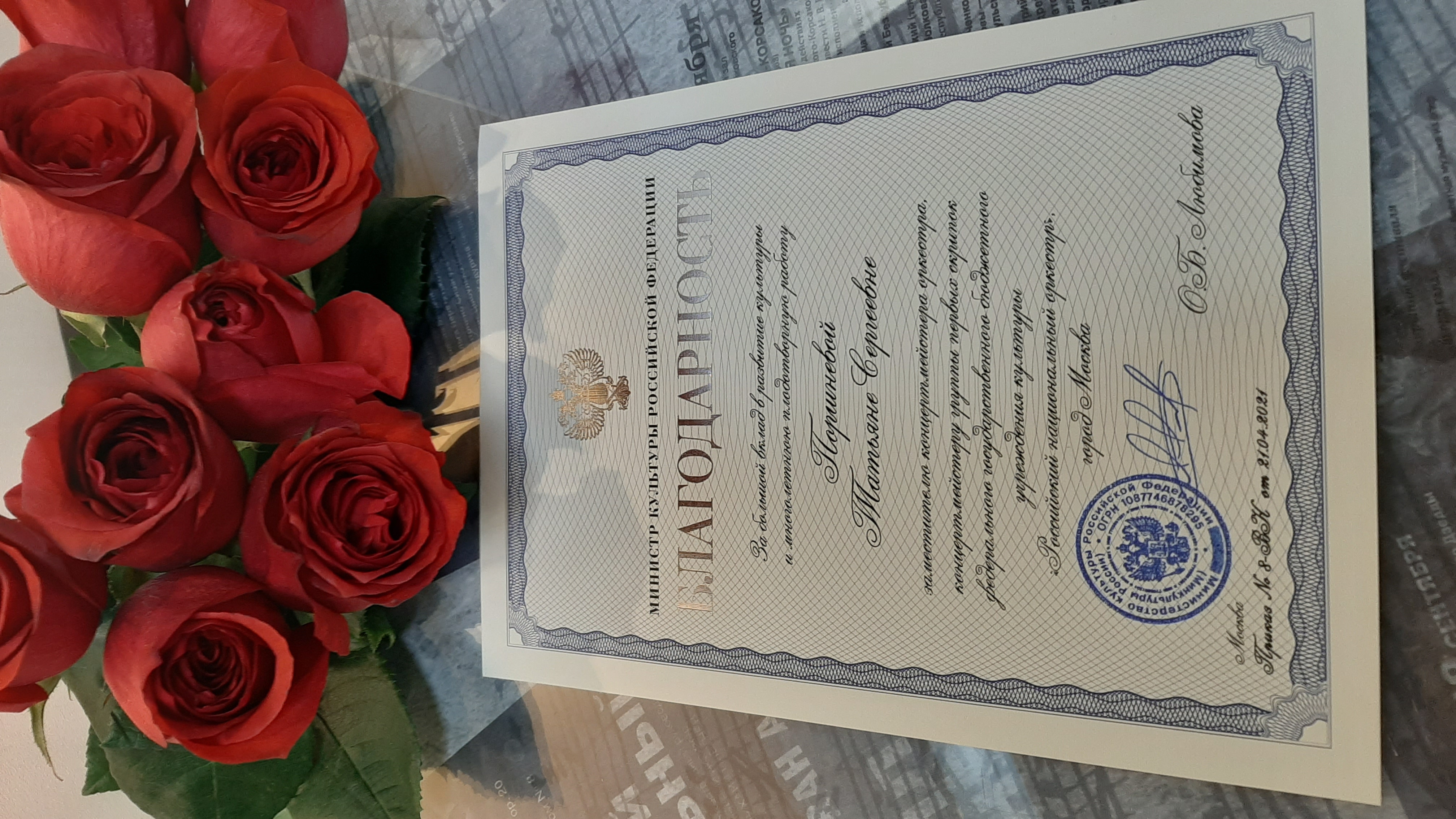 За вклад в развитие отечественной культуры и искусства, многолетнюю плодотворную деятельность указом Президента №548 от 06.08.2025 почетное звание «Заслуженный артист РФ» присвоено Татьяне Сергеевне Поршневой – концертмейстеру Российского национального оркестра.